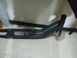 Chasis de patinete eléctrico con la marca NOSSTO. - Color negro. - Diseño con línea blanca.