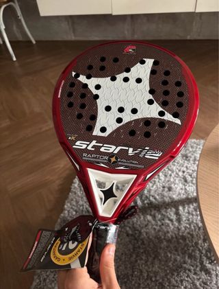 Pala de pádel Starvie Raptor, con un diseño moderno y llamativo. - Pala de pádel. - Modelo Raptor. - Marca Starvie. - Color rojo y blanco.