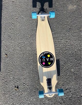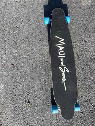 Longboard de la marca Maui and Sons con un diseño moderno y llamativo. - Tabla negra con logo blanco. - Ruedas de color azul brillante.