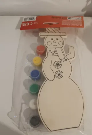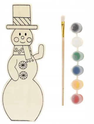 Kit de manualidades navideñas para crear tu propio muñeco de nieve. - Figura de muñeco de nieve de madera sin pintar. - Incluye pincel. - Contiene pinturas de varios colores.