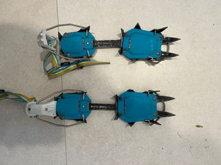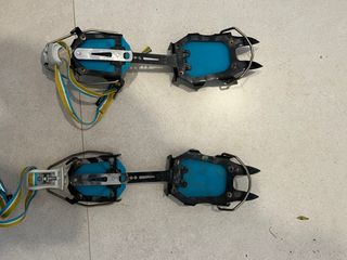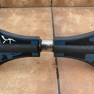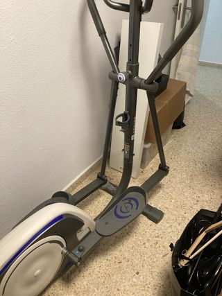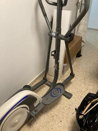 Elíptica de la marca Domyos, ideal para entrenamientos en casa. Su diseño combina funcionalidad y estética. - Estructura principal en color gris oscuro. - Pedales y cubiertas en blanco con detalles en azul. - Manillar con agarres ergonómicos. tan solo tiene un apoyo suelto que no afecta al funcionamiento