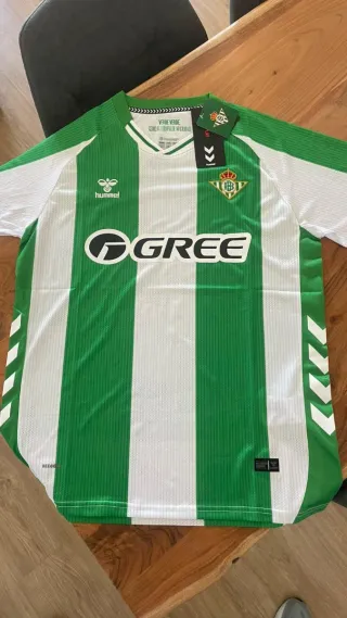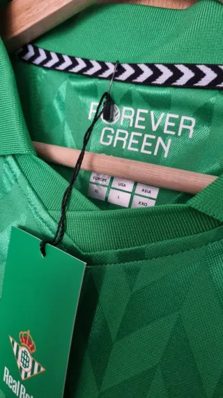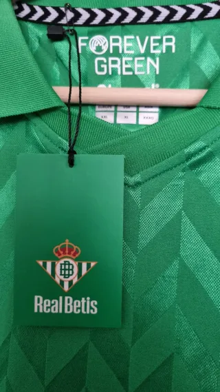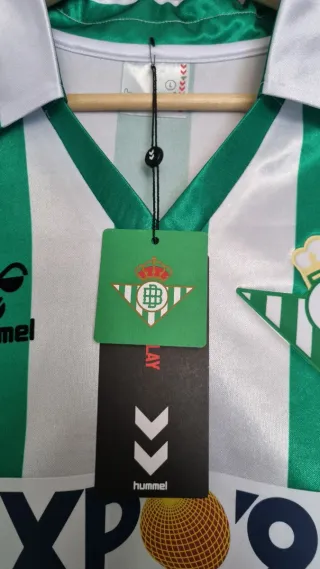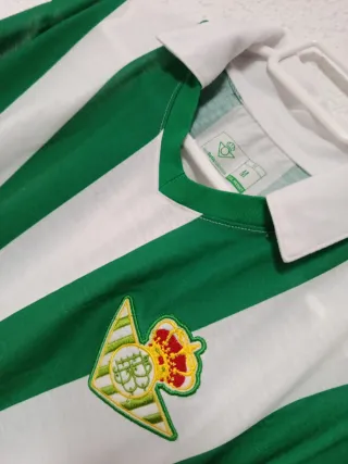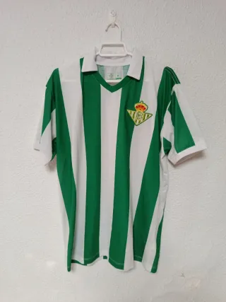 Camiseta de fútbol retro del Real Betis Balompié. Es de algodón , finita Merchandising oficial del betis - Diseño a rayas verdes y blancas. - Escudo del equipo bordado en el pecho.
