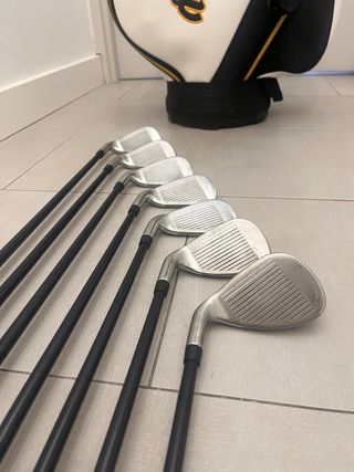 Set de hierros y bolsa Callaway Warbird. Todo comprado nuevo hace dos años. Con el desgaste mínimo del uso. Muy cuidados. La bolsa casi como nueva. - Incluye hierros de SW a 5 - Varilla R-Flex grafito (color negro) - Grips Callaway originales - Bolsa carro Callaway Warbird - Regalo madera 5 del mismo set con su funda Palos de iniciación, ligeros y con perdón. Los vendo porque me creo mejor de lo que realmente soy (jejeje) y me quiero dar un capricho