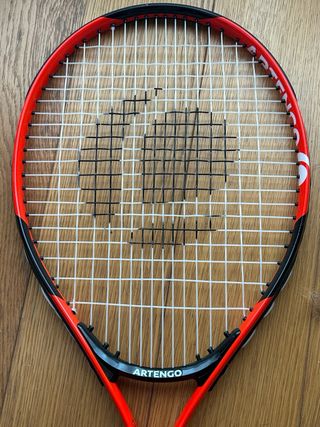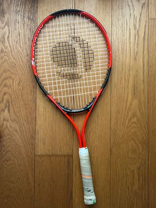 Raqueta de tenis Artengo TR 130 de 25 pulgadas. Válido para niños a partir de 9-10 años o adulto pequeño (para mí midiendo 1.62 era la más cómoda). Usada un par de veces pero mantiene las cuerdas tensadas y sin desgaste y el vendaje del mango completamente nuevo. Ligera y cómoda. Color rojo brillante blanco y negro. Comprada en decathlon por 25€
