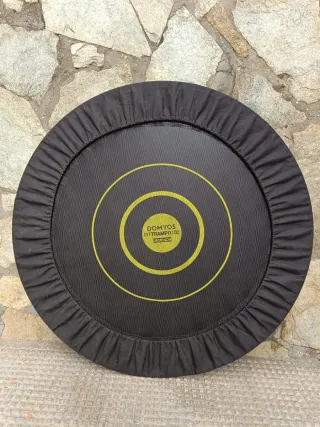 Mini trampolín Domyos Fittrampo100 de Decathlon. Ideal para ejercicio en casa. - Diseño circular con círculos concéntricos amarillos. - Cubierta negra con borde elástico. - Marca: Domyos. Para adultos y muy divertido para los peques