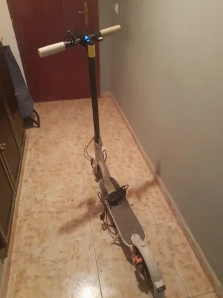 Patinete eléctrico de color negro, ideal para desplazamientos urbanos. Motivo de venda: mudanza - Diseño plegable para facilitar su transporte. - Plataforma antideslizante para mayor seguridad. - Ruedas resistentes para un rodaje suave.