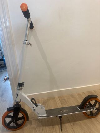 Patinete de la marca Lionelo con un diseño moderno. - Color blanco y detalles en naranja. - Plataforma antideslizante. - Ruedas de goma.