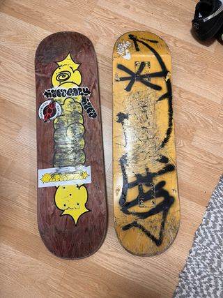 Lote de tablas de skate para reciclar o reutilizar. Ideales para proyectos creativos. - Material de madera multicapa. - Bordes con detalles de colores. - Superficie con desgaste de uso.