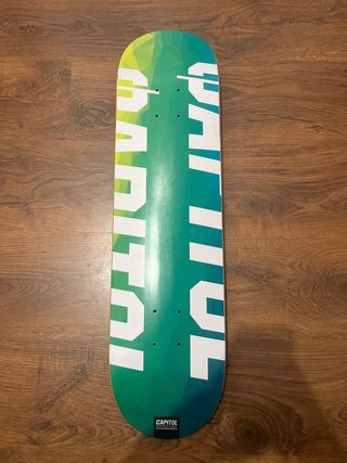 Tabla de skate con un diseño degradado en tonos verdes y amarillos. Presenta el logo de Capitol en blanco a lo largo de la tabla. - Diseño geométrico poligonal. - Logo grande de Capitol. - Incluye el logo de Capitol Skateboards en la parte inferior. - Medida 8