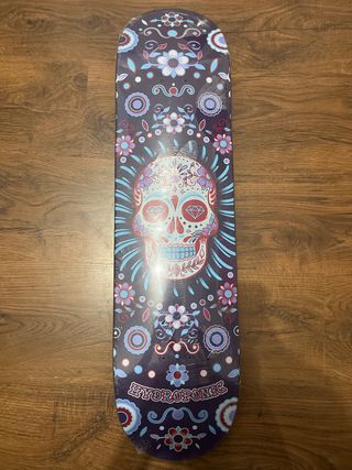 Tabla de skate con un diseño llamativo de calavera y flores. - Diseño inspirado en el Día de Muertos. - Colores vibrantes sobre fondo oscuro. - Marca: Hydroponic. - Medida 8