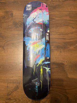 Tabla de skate con un diseño artístico y vibrante. Presenta salpicaduras de pintura en tonos azules, rosas y amarillos sobre un fondo oscuro. - Diseño abstracto. - Marca JART. -Medida 8.125