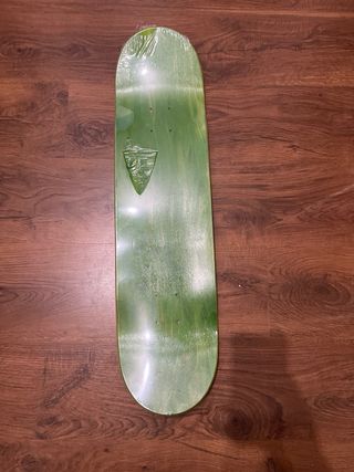Tabla de skate de la marca Nomad. Presenta un diseño con detalles en blanco y verde. - Parte superior con gráfica. - Bordes de madera visibles.