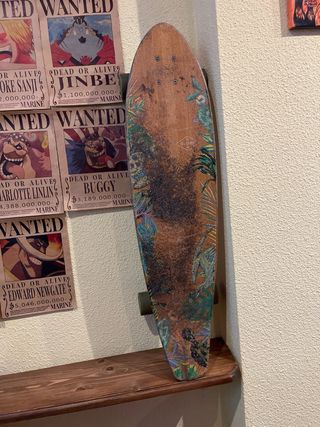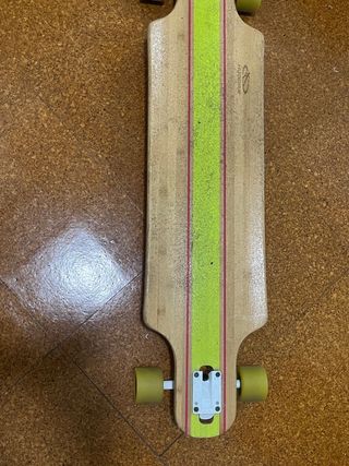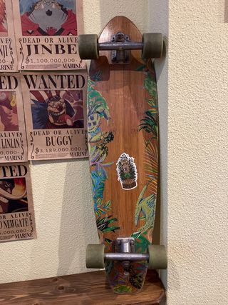 Longboard con un diseño vibrante y tropical, perfecto para pasear. - Tabla de madera con estampado de hojas y animales. - Ruedas de color verde. - Ejes metálicos. - Puedo cambiarlo por una bicicleta o bmx