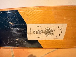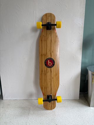 Skate de bambú con un diseño natural y ruedas llamativas. - Tabla de bambú con acabado liso. - Ruedas de color amarillo. - Logo circular en el centro de la tabla.