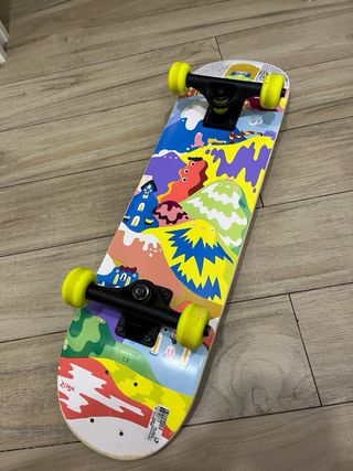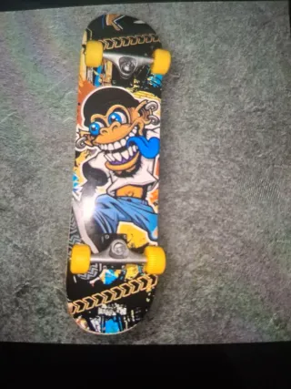 Skate con diseño divertido de mono loco. Muy usado ideal para princiantes - Gráficos coloridos y llamativos. - Ruedas amarillas. - Ejes plateados.