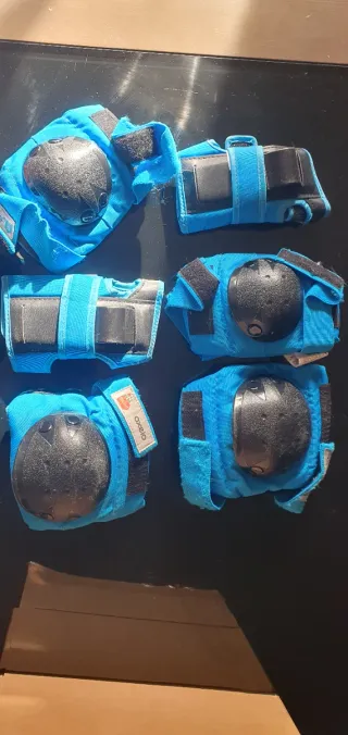 Set de protecciones para patinaje o ciclismo. Talla XS - Color azul y negro - Incluye rodilleras y muñequeras. - Cierre con velcro. - Marca Oxelo.