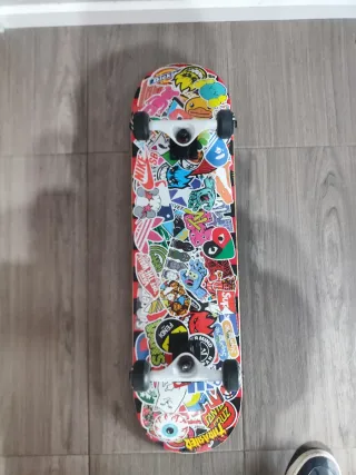Skate decorado con una gran variedad de pegatinas. - Diseño único y llamativo. - Ideal para coleccionistas o para usar.