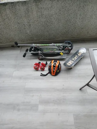Lote de patinetes, tabla de skate y casco de protección. - Dos patinetes de colores plateado y verde. - Tabla de skate con diseño. - Casco de protección naranja y negro.