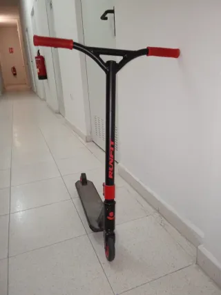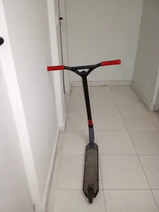 Monopatín de estilo skater con detalles en rojo y negro. - Manillar con puños rojos. - Plataforma de color gris oscuro. - Ruedas con detalles rojos.