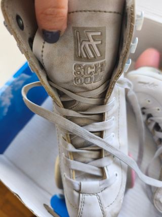 Patines quad clásicos Skates Belati, modelo School, ideales para patinaje recreativo, iniciación y pista. Fabricados en Italia, con bota alta blanca de estilo tradicional y ruedas bicolor (rosa y crema). Se venden con caja original. Presentan signos de uso visibles (amarilleo y marcas en la bota, desgaste estético), pero funcionan correctamente y las ruedas giran bien. Perfectos para quien busca patines de calidad a buen precio o para restaurar. 🔍 Características Marca: Skates Belati Modelo: School Talla: 40 EU - pie 35 (ver etiqueta) Tipo: Patines quad (4 ruedas) Color: Blanco / ruedas rosa y crema Ruedas: Ø57 mm – dureza HD 56