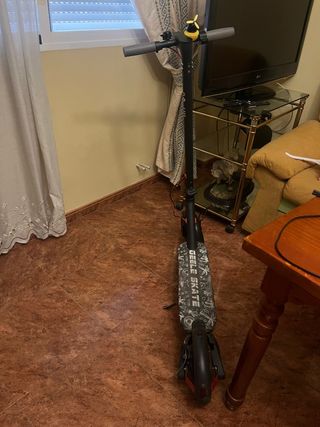 Patinete eléctrico con un diseño moderno y llamativo. - Plataforma con diseño gráfico GEELU SKATE. - Manillar gris con detalles. - Rueda trasera negra con detalles rojos. - El freno está tocado, pero frena bien. - La batería está tocada, no acelera a más de 15 km/h. - El manillar anda suelto. - Ruedas trasera y delantera recién cambiadas, están prácticamente nuevas. - Se vende con cargador incluido. PRECIO NEGOCIABLE