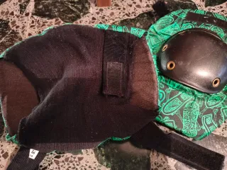 Protecciones para skate o snowboard. - Diseño con estampado de huellas. - Color verde y negro. - Cierre de velcro.