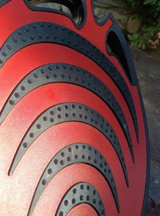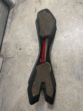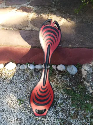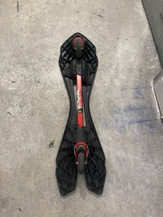 Skate de dos ruedas RAZZQ con un diseño llamativo en rojo y negro. Nunca se ha usado, soy malísimo. Las ruedas están impecables. - Diseño de dos tablas unidas por un eje. - Superficie con patrón de líneas curvas y puntos. - Asas de agarre en los extremos.
