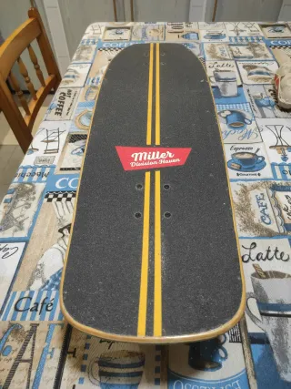 Tabla de skate Miller Division Haven con un diseño clásico.76cm*24cmm.Rueda 70 mm 80 a. Tiene tail, superfucie cóncava,incluye llave de regalo. - Diseño con dos líneas amarillas centrales. - Logo de Miller Division Haven en rojo.