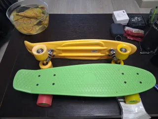 Se venden dos patinetes tipo Penny Skater, uno amarillo y otro verde. - Patinete amarillo con ruedas amarillas. - Patinete verde con ruedas rojas y amarillas.
