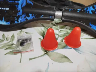 Tabla de skate de dos ruedas con un diseño llamativo. - Diseño con llamas en rojo, azul y amarillo. - Estructura negra. - Ruedas giratorias. Nunca lo usaron,la funda es de otro que tenía por eso está machacadita.
