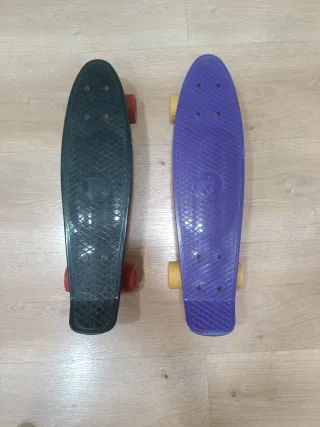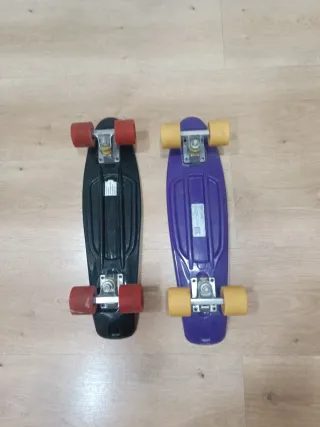 Dos skate penny, uno negro y otro morado. Perfectos para desplazamientos cortos o para iniciarse en el skate. - Tabla de plástico resistente. - Ruedas de poliuretano. - Diseño compacto y ligero. 10 euros cada uno.