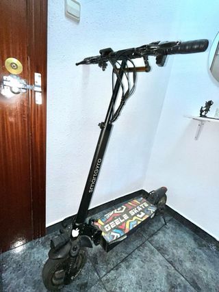 Patín eléctrico SmartGyro en color negro. Ideal para desplazamientos urbanos. !!No enciende ya que seguramente tenga la batería dañada pero cambiándola seguro funciona perfecto!! - Diseño moderno y funcional. - Plataforma con diseño GEELE SKATE colorido. - Manillar ajustable en altura. - Ruedas para un rodaje suave. -La luz delantera funciona pero está un poco rota así que lo mejor sería cambiarla