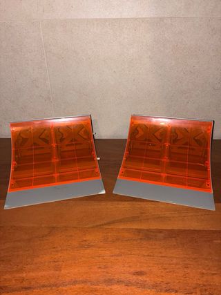 Dos rampas para jugar con Tech Deck y monopatines de dedo. En buen estado, sin roturas. Ideales para montar circuito. - Diseño curvo con superficie naranja. - Base gris resistente.