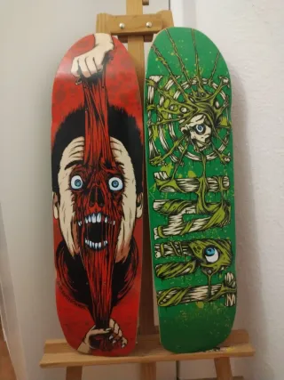 Dos tablas de skate Jart con diseño exclusivo de Marcos Cabrera. Ideales para coleccionistas o skaters que buscan un estilo único. - Diseño gráfico llamativo. - Marca Jart. - Colaboración con Marcos Cabrera.