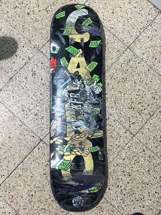 Tabla de skate Jart Angelo Caro con un diseño llamativo. - Tamaño: 8.0 pulgadas. - Gráficos con temática de dinero y personaje animado.