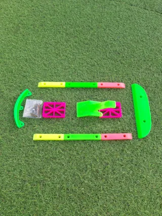 Skate con diseño llamativo en color verde brillante y detalles en morado. - Tabla con gráfico grande. - Ruedas verdes.