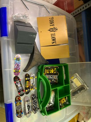 Gran lote de mini skate que incluye varias tablas, rampas y accesorios. - Variedad de tablas de skate mini con diferentes diseños. - Rampas de diferentes tamaños y formas. - Caja organizadora verde para guardar los accesorios. - Bolsa con tornillos y piezas para montaje.