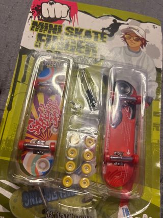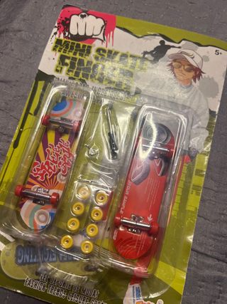 Set de mini skates para dedos. - Incluye dos mini skates con diseños. - Incluye ruedas de repuesto y herramientas.