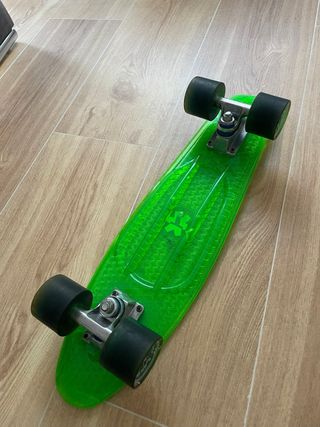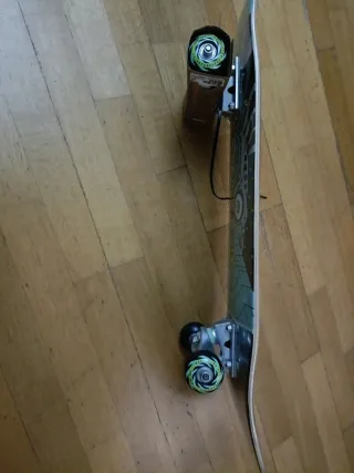 Tabla de skate diseñada para jóvenes patinadores. Adecuada para edades entre 7 y 15 años. Solo se ha utilizado una vez. - Tabla de madera. - Ruedas verdes y negras.