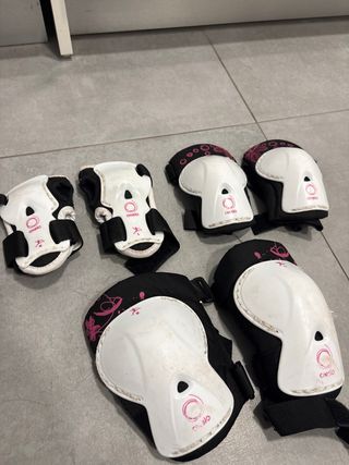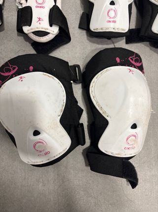 Set de protecciones para patinaje o skate. Comprado en Amazon - Incluye rodilleras, coderas y muñequeras. - Fabricadas en material resistente. - Cierre ajustable con velcro. - Incluye bolsa de malla para guardarlas. - Ligeramente rozadas las rodilleras y más rozada una muñequera
