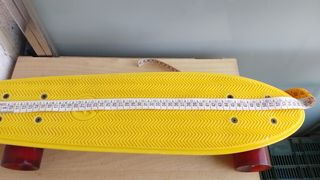Tabla de skate con diseño divertido. - Color amarillo vibrante. - Gráficos de limón y texto mello. - Longitud de 78cm.