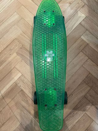 Monopatín con un diseño vibrante y llamativo, ideal para quienes se inician en el skate. - ruedas con luces al girar. - 57 cm. de plástico. - Ejes metálicos. - Diseño gráfico multicolor. - Superficie antideslizante.