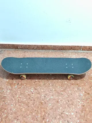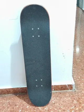 Monopatín de madera con griptape. Está en buenas condiciones, aunque presenta algunas señales de uso.