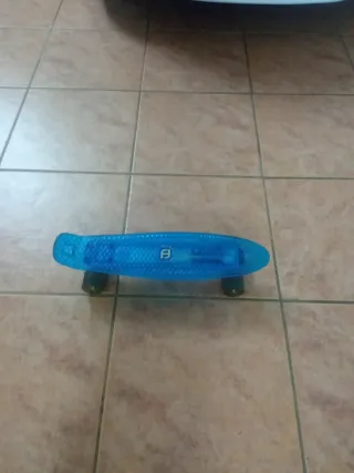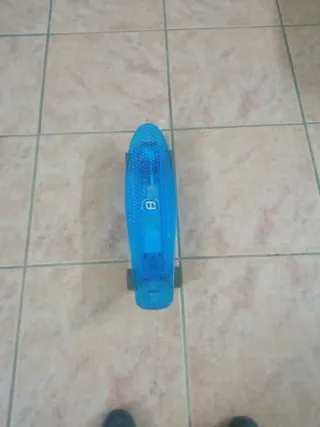 Skate tipo penny board de color azul transparente. Ideal para desplazamientos cortos y trucos básicos. - Tabla de plástico resistente. - Ruedas de poliuretano. - Ejes metálicos.