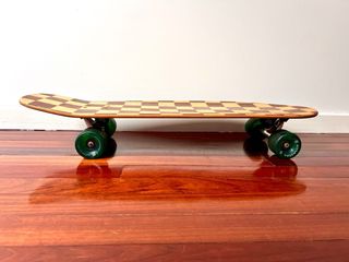 Tabla de skate completa con diseño de tablero de ajedrez. Está en muy buen estado. Surfear el asfalto. - Diseño de tablero de ajedrez en tonos marrones y beige. - Ruedas verdes. - Ideal para principiantes o para uso recreativo.