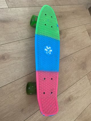 Skate tipo Penny con un diseño multicolor vibrante. - Cubierta con textura antideslizante. - Ruedas verdes. - Diseño de tres colores: verde, azul y rosa.