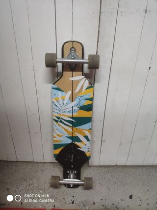 Skate de cuatro ruedas en buen estado. Ideal para disfrutar del patinaje. - Diseño con estampado colorido. - Ruedas de color marrón.