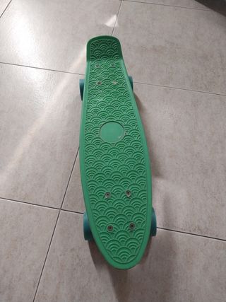 Monopatín tipo Penny Lane en color verde. Está en buen estado. - Ideal para principiantes. - Diseño de escamas. - Ruedas de color azul.