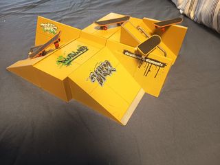 Set de mini skatepark con rampas y accesorios para practicar trucos. Incluye cuatro mini skates - 6 piezas de rampas. - 4 mini skates