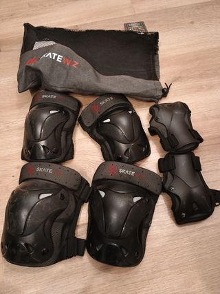 Set de protecciones para patinaje o monopatín. - Incluye rodilleras, coderas y muñequeras. - Marca SKATE WIZ. - Bolsa de malla para guardarlas.